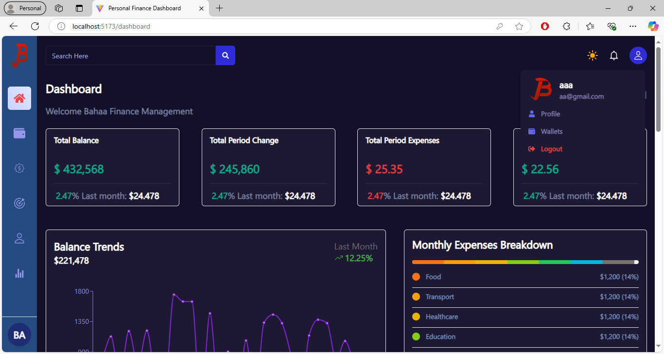 An interactive dashboard for visualizing income, expenses, and financial health through charts and reports.