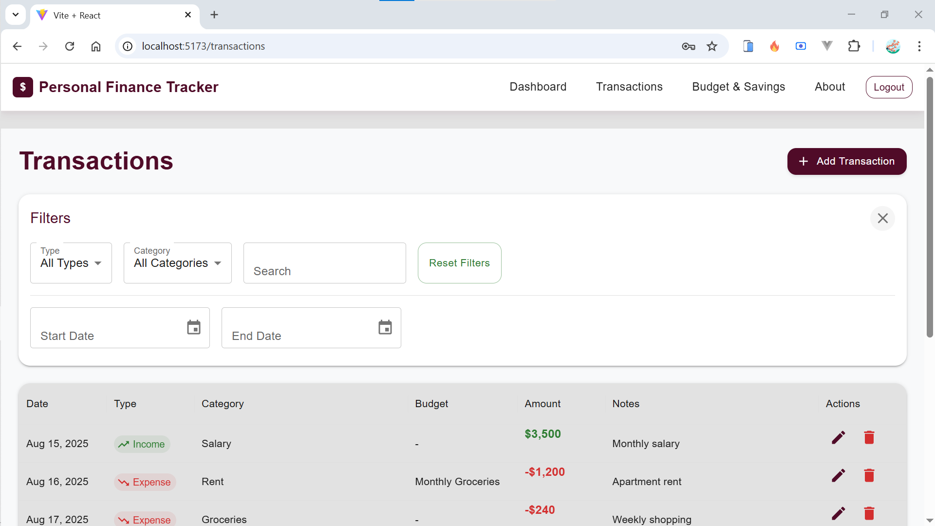 A secure finance management web application that enables users to track income, expenses, and budgets with visual analytics. Implemented JWT and Google OAuth2 authentication and built RESTful APIs for transactions and budgets.